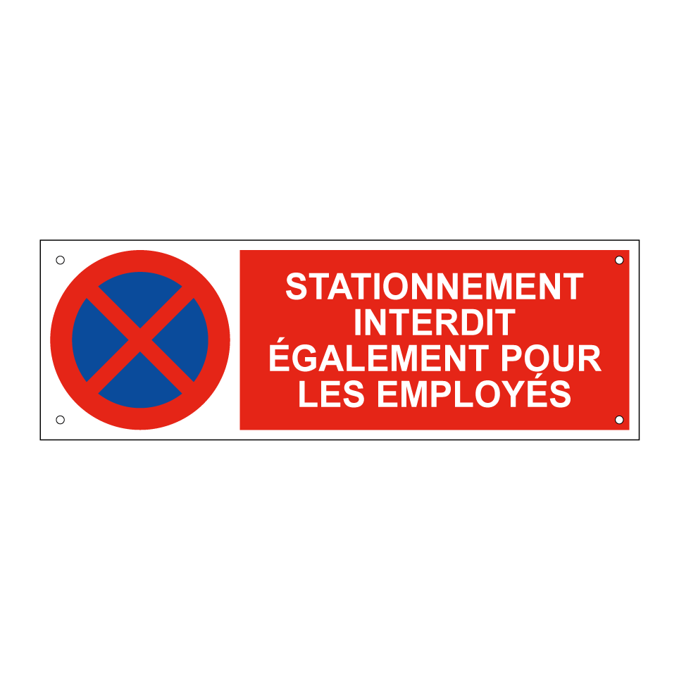 Panneau d'interdiction de stationner avec le texte : "Stationnement interdit également pour les employés" et une symbolique claire.