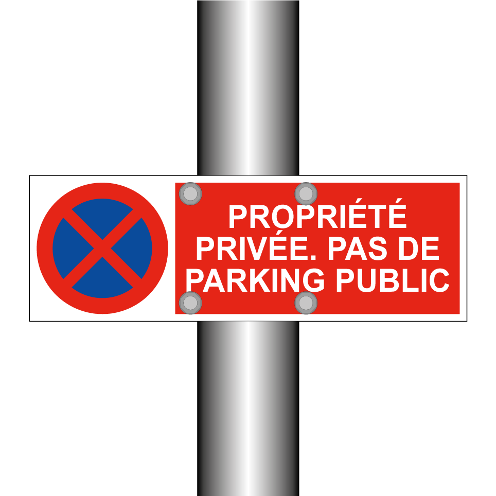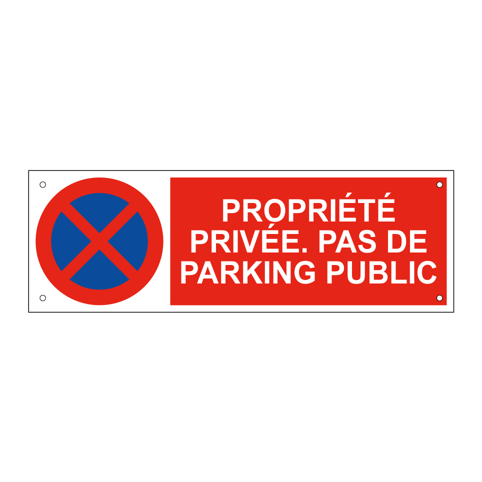Panneau d'interdiction de stationner avec le texte : "Propriété privée. Pas de parking public" et une symbolique claire.