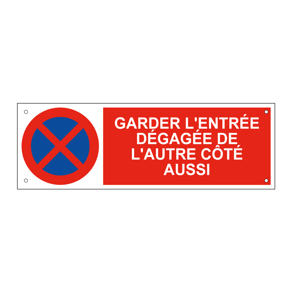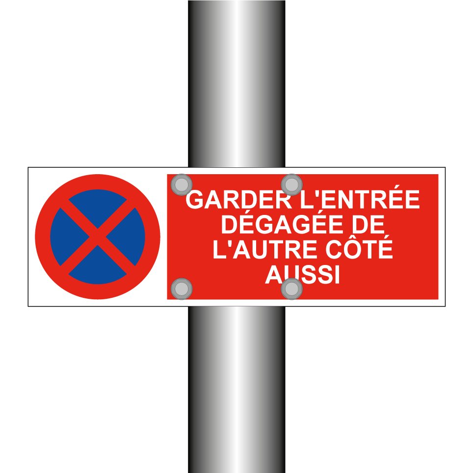 Panneau d'interdiction de stationner avec le texte : "Garder l'entrée dégagée de l'autre côté aussi" et une symbolique claire.