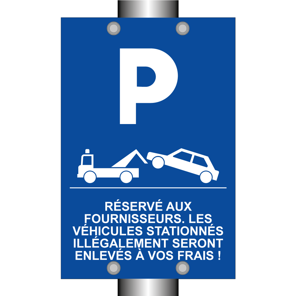 Panneau de stationnement avec le texte : "Réservé aux fournisseurs. Les véhicules stationnés illégalement seront enlevés à vos frais !" et une symbolique claire.