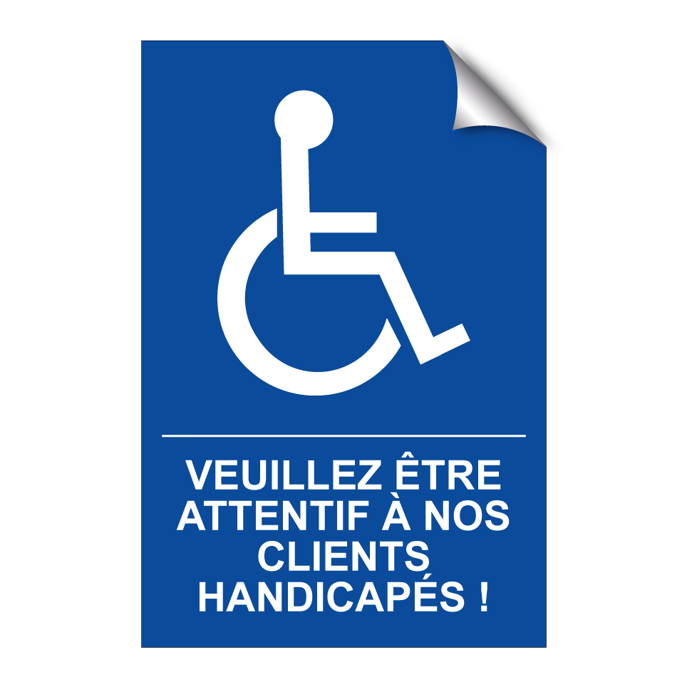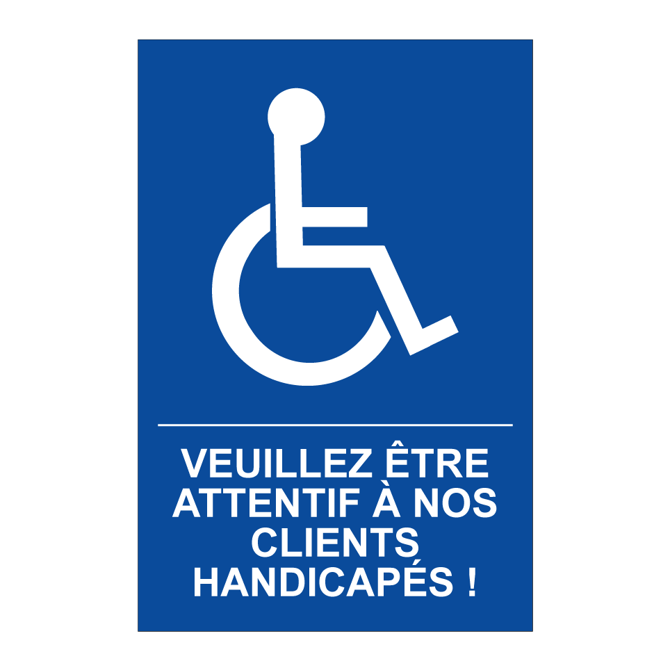 Panneau de stationnement avec le texte : "Veuillez être attentif à nos clients handicapés !" et une symbolique claire.