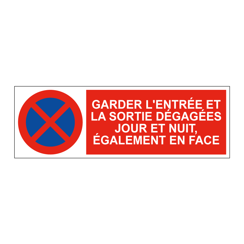 Panneau d'interdiction de stationner avec le texte : "Garder l'entrée et la sortie dégagées jour et nuit, également en face" et une symbolique claire.