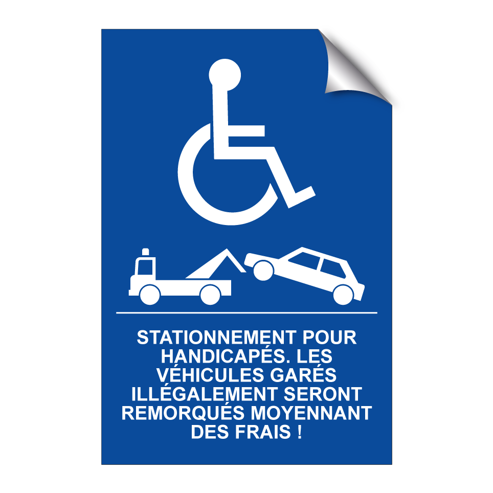 Panneau de stationnement avec le texte : "Stationnement pour handicapés. Les véhicules garés illégalement seront remorqués moyennant des frais !" et une symbolique claire.