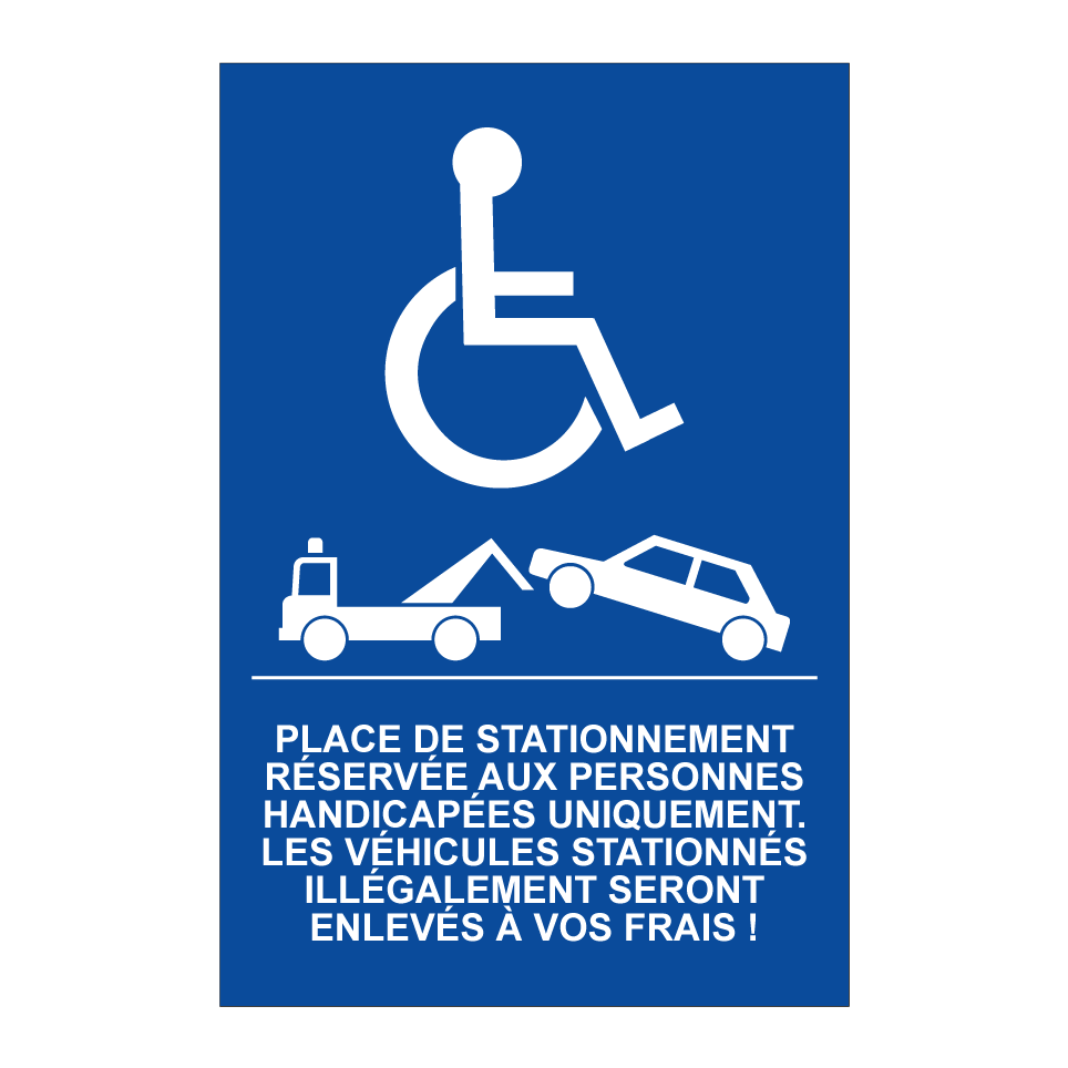 Panneau de stationnement avec le texte : "Place de stationnement réservée aux personnes handicapées uniquement. Les véhicules stationnés illégalement seront enlevés à vos frais !" et une symbolique claire.