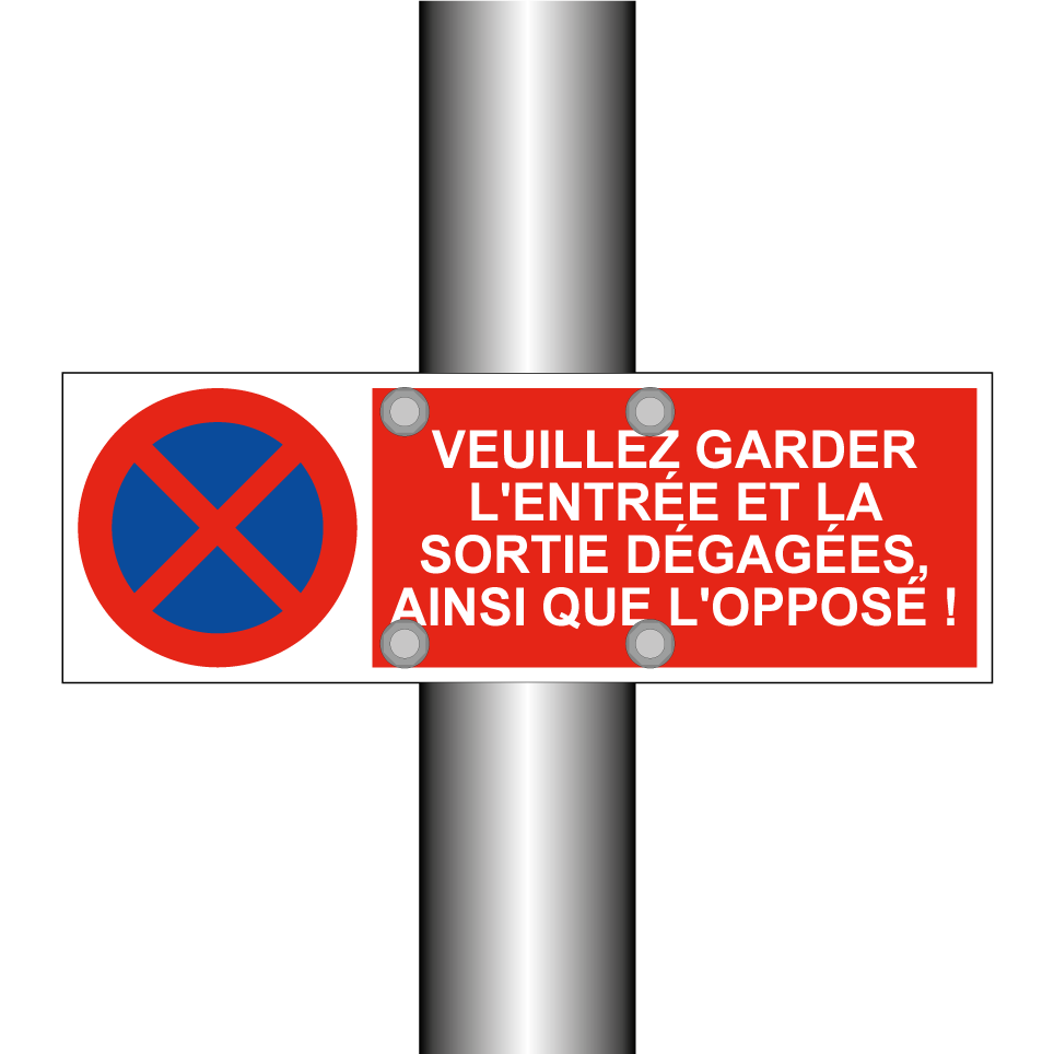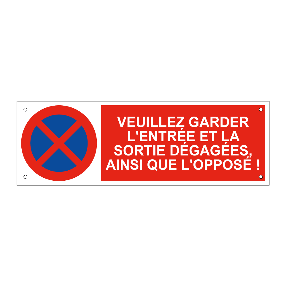 Panneau d'interdiction de stationner avec le texte : "Veuillez garder l'entrée et la sortie dégagées, ainsi que l'opposé !" et une symbolique claire.