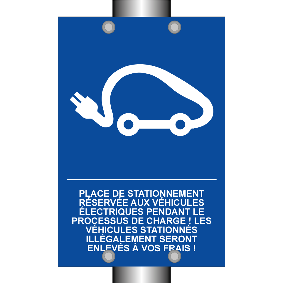 Ce panneau de stationnement est idéal pour les zones réservées aux véhicules électriques, garantissant un espace dédié pendant la recharge. Parfait pour les parkings publics, les centres commerciaux ou les entreprises, il assure que seuls les véhicules autorisés utilisent ces emplacements. Avec son fond bleu et son texte blanc, il est facilement visible et comprend une symbolique claire pour éviter les infractions. Installez-le à l'entrée des zones de recharge pour informer et dissuader les stationnements non autorisés.