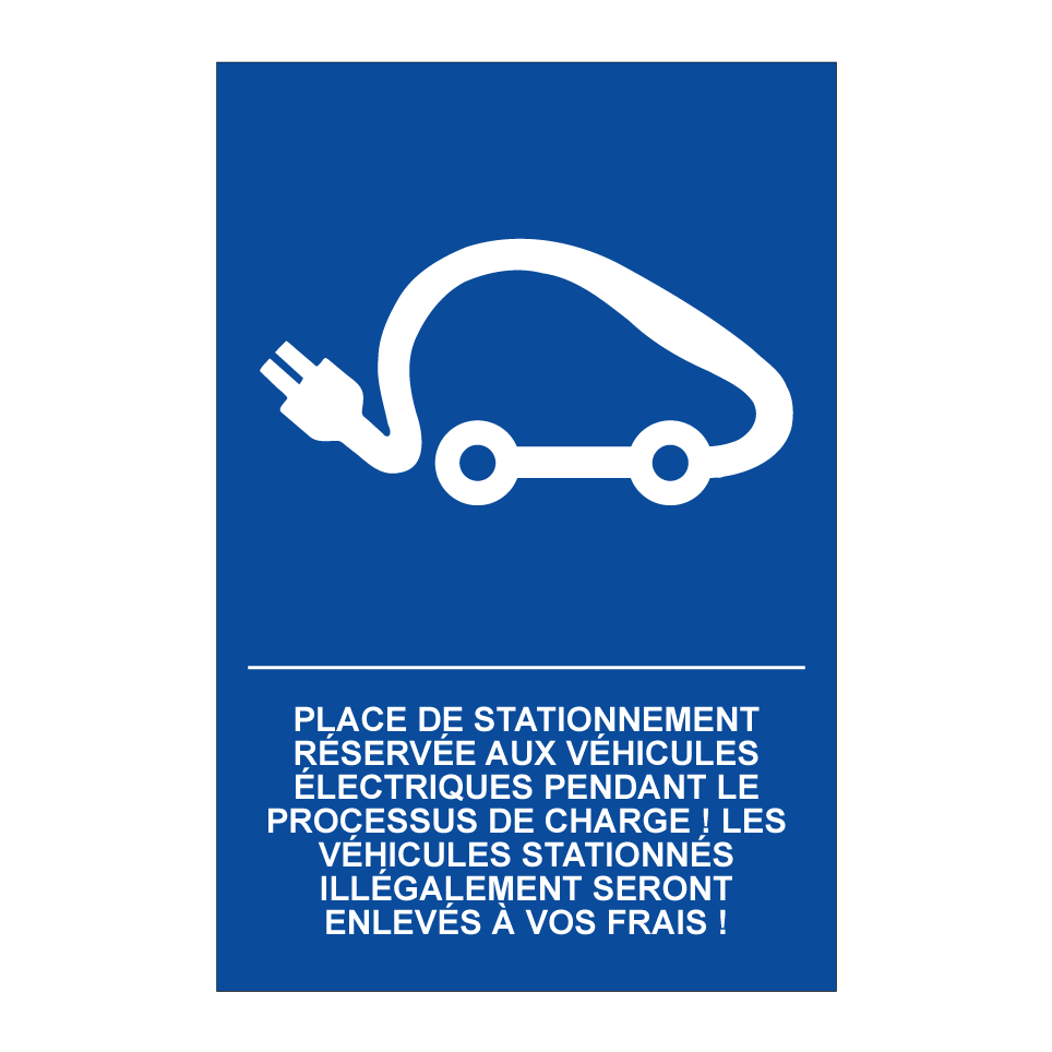 Panneau de stationnement avec le texte : "Place de stationnement réservée aux véhicules électriques pendant le processus de charge ! Les véhicules stationnés illégalement seront enlevés à vos frais !" et une symbolique claire.