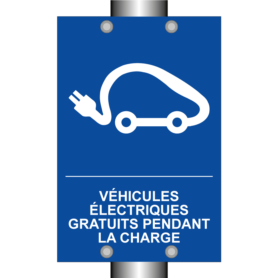 Panneau de stationnement avec le texte : "Véhicules électriques gratuits pendant la charge" et une symbolique claire.