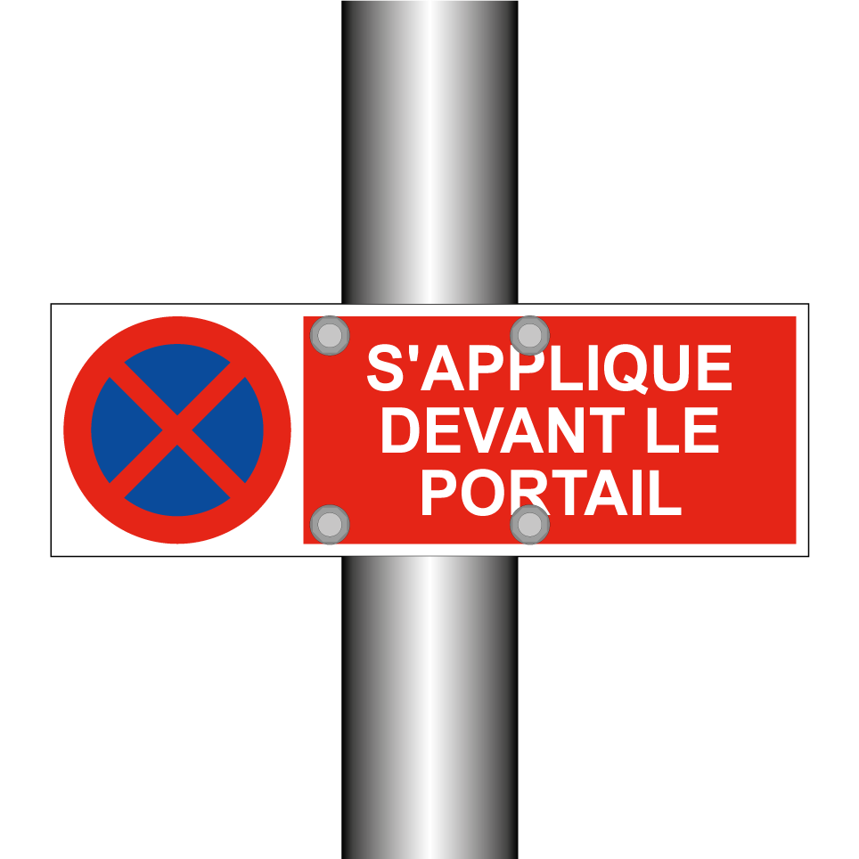 Panneau d'interdiction de stationner avec le texte : "S'applique devant le portail" et une symbolique claire.