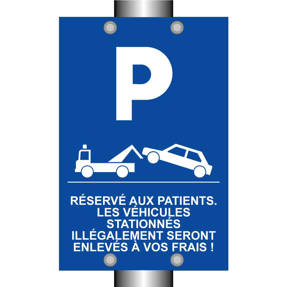 Panneau de stationnement avec le texte : "Réservé aux patients. Les véhicules stationnés illégalement seront enlevés à vos frais !" et une symbolique claire.