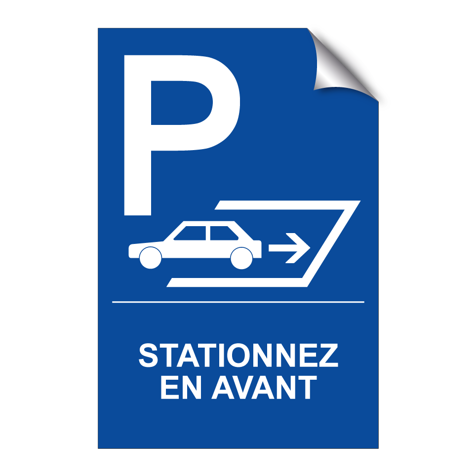 Panneau de stationnement avec le texte : "Stationnez en avant" et une symbolique claire.