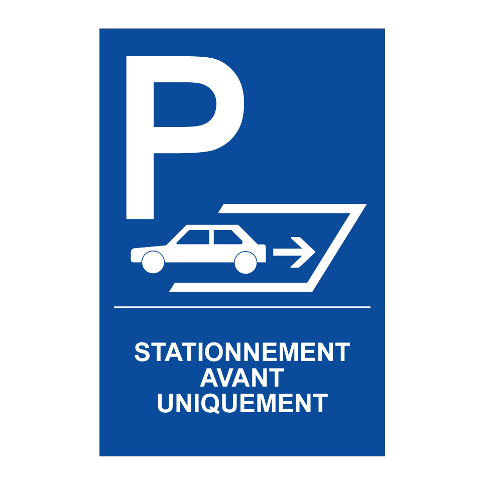 Panneau de stationnement avec le texte : "Stationnement avant uniquement" et une symbolique claire.