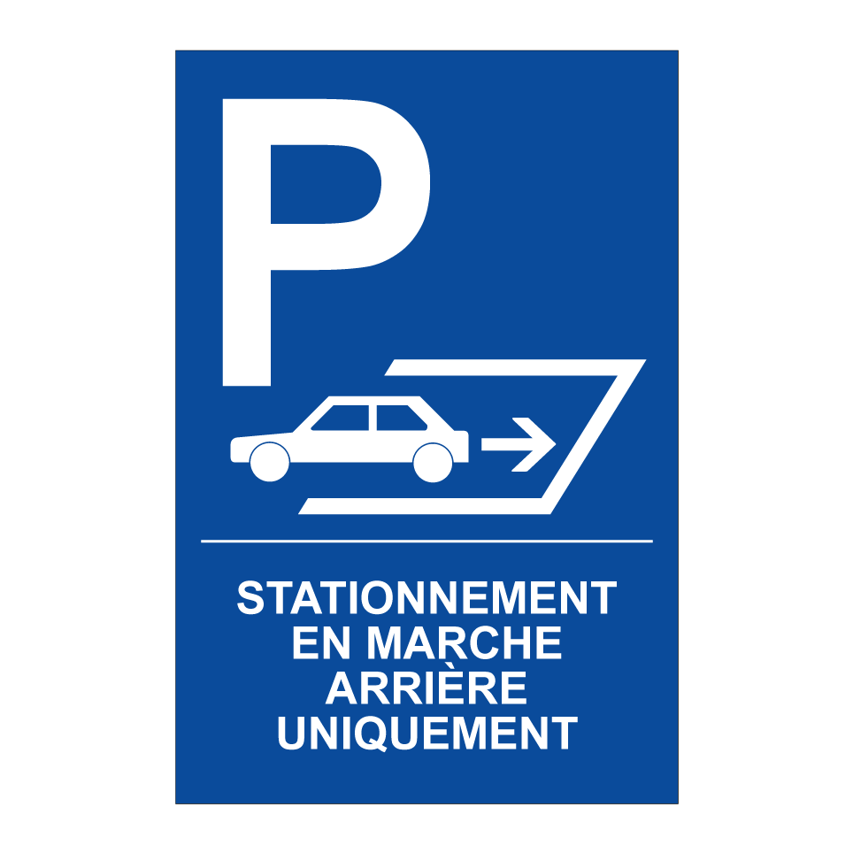 Panneau de stationnement avec le texte : "Stationnement en marche arrière uniquement" et une symbolique claire.
