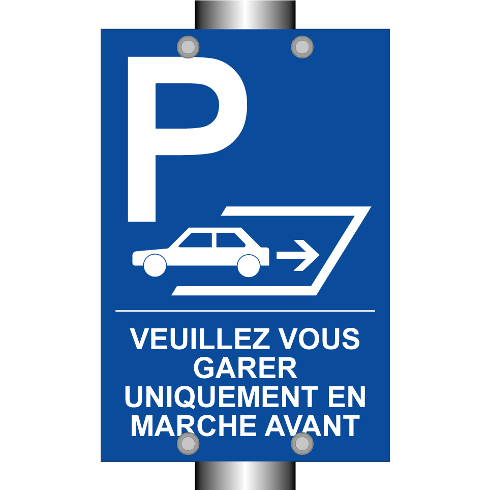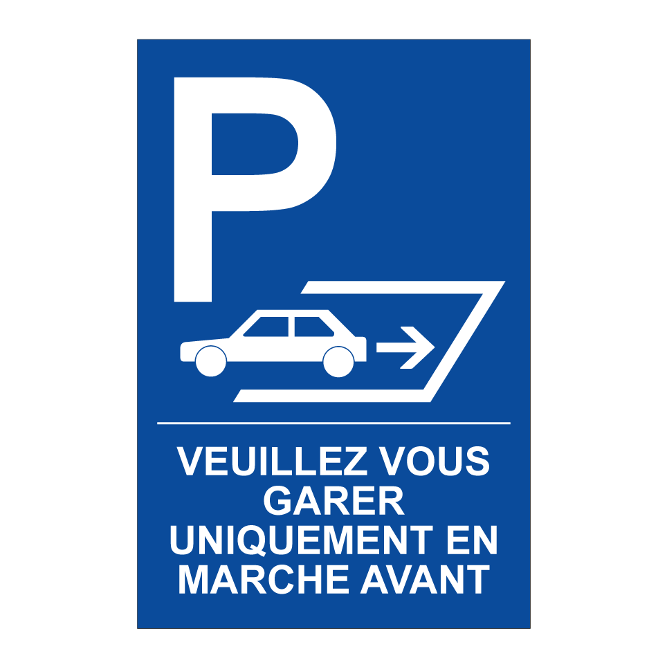 Panneau de stationnement avec le texte : "Veuillez vous garer uniquement en marche avant" et une symbolique claire.