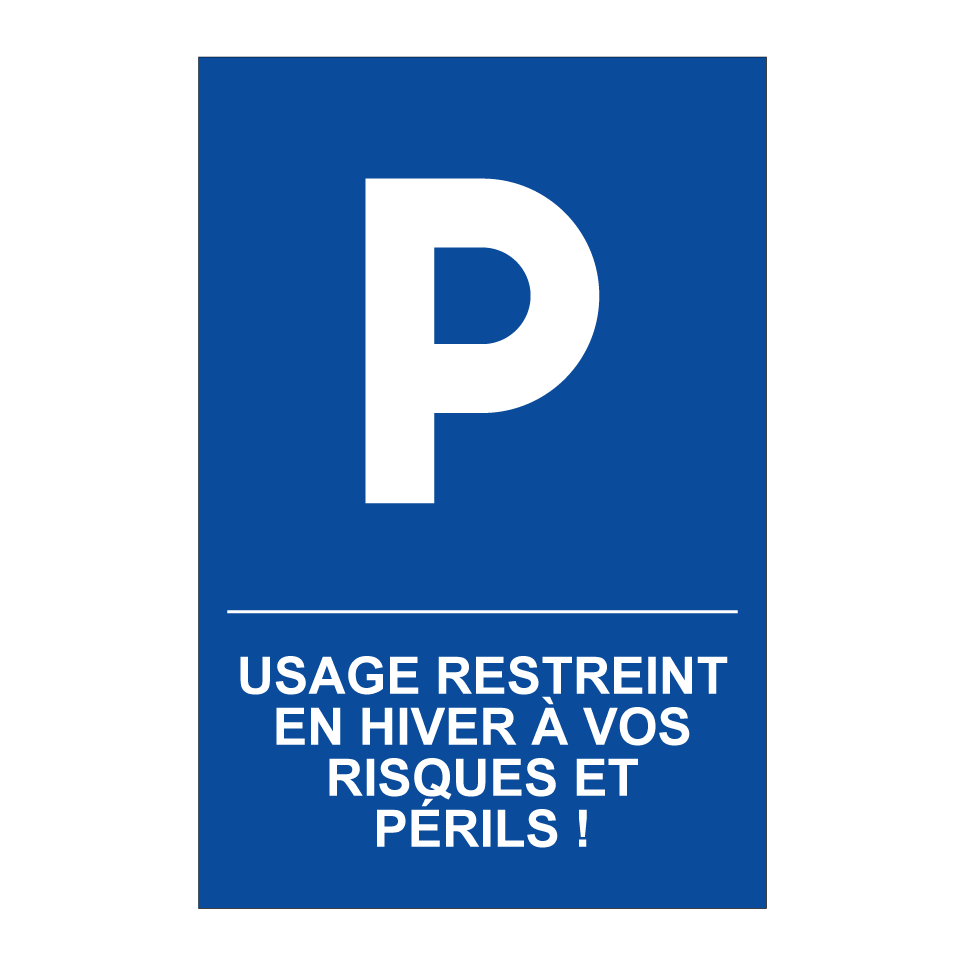 Panneau de stationnement avec le texte : "Usage restreint en hiver à vos risques et périls !" et une symbolique claire.
