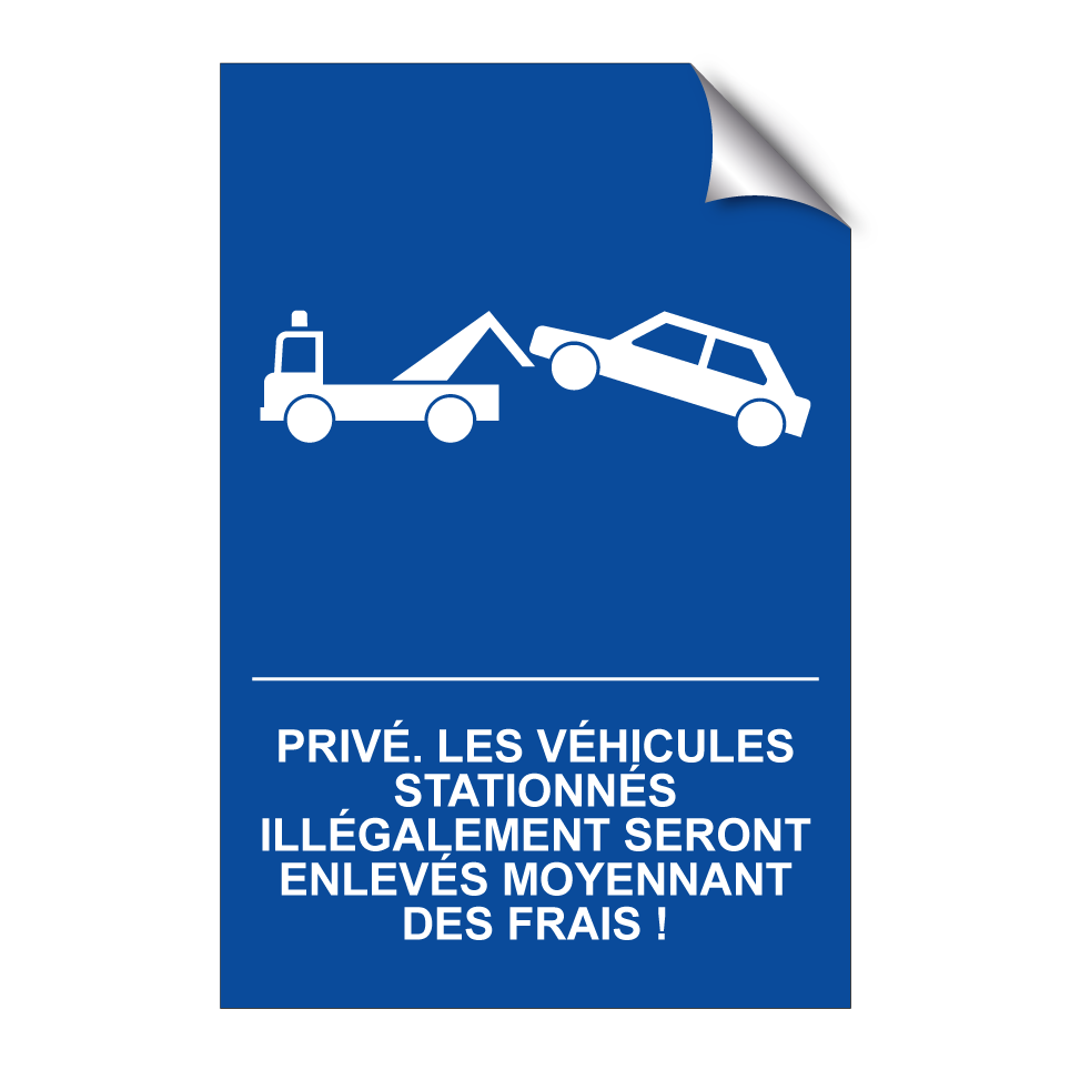 Panneau de stationnement avec le texte : "Privé. Les véhicules stationnés illégalement seront enlevés moyennant des frais !" et une symbolique claire.