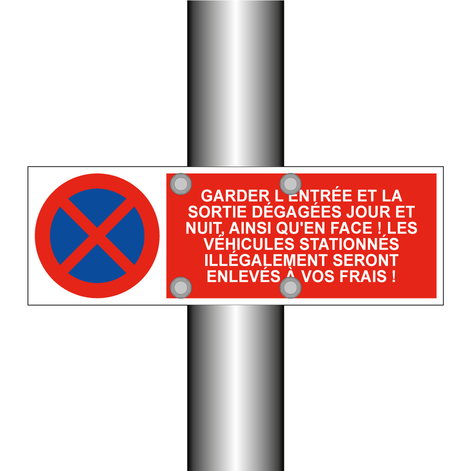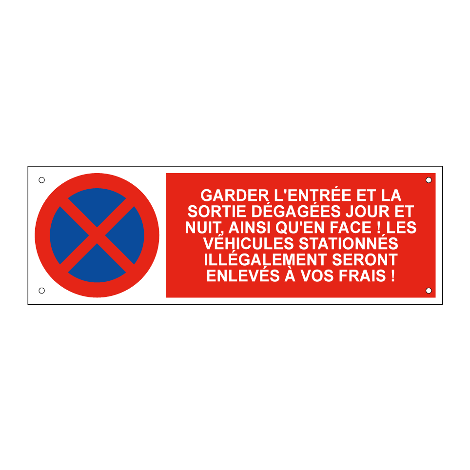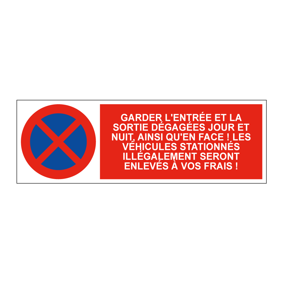 Panneau d'interdiction de stationner avec le texte : "Garder l'entrée et la sortie dégagées jour et nuit, ainsi qu'en face ! Les véhicules stationnés illégalement seront enlevés à vos frais !" et une symbolique claire.