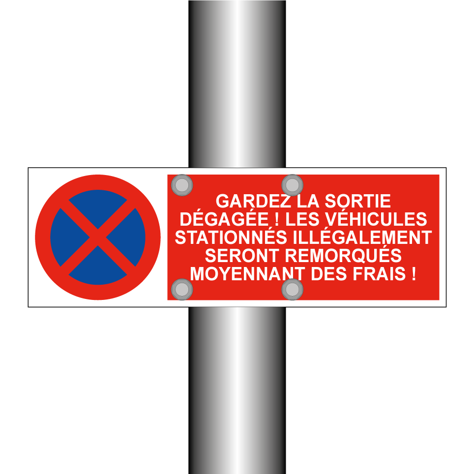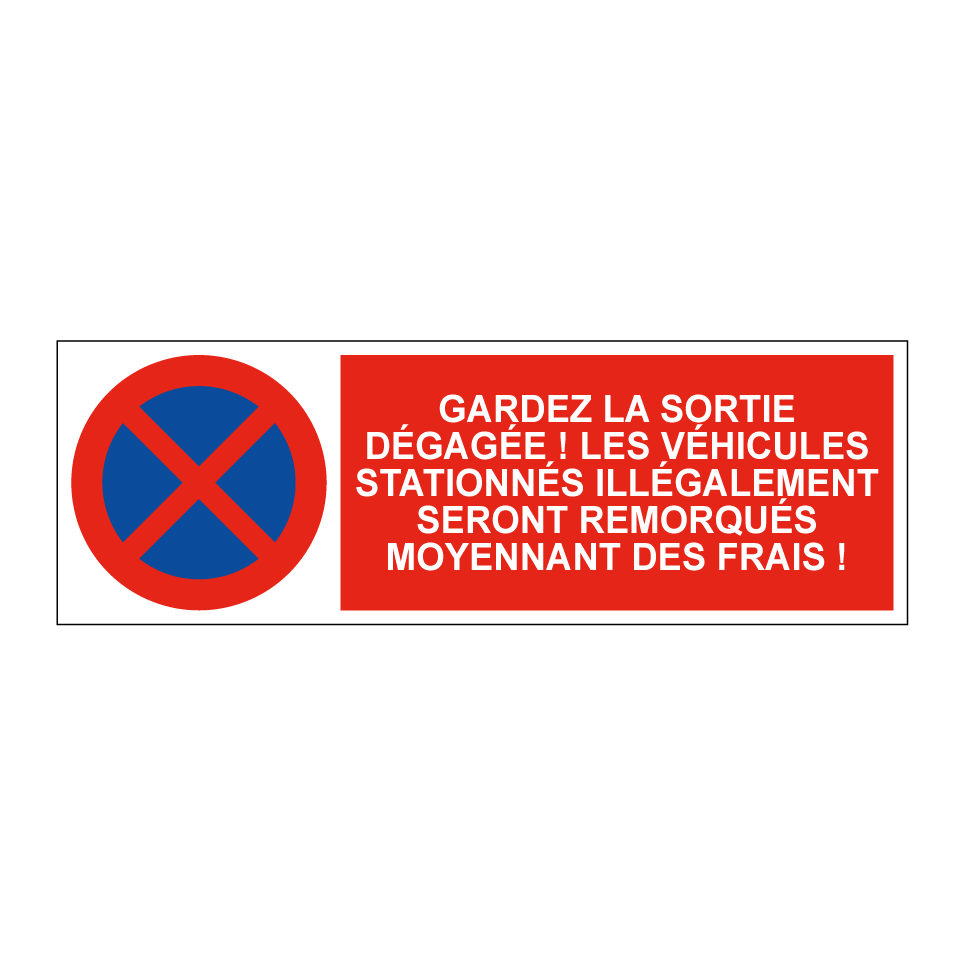 Panneau d'interdiction de stationner avec le texte : "Gardez la sortie dégagée ! Les véhicules stationnés illégalement seront remorqués moyennant des frais !" et une symbolique claire.