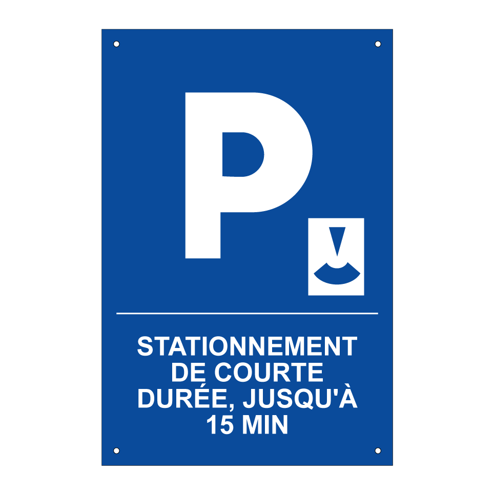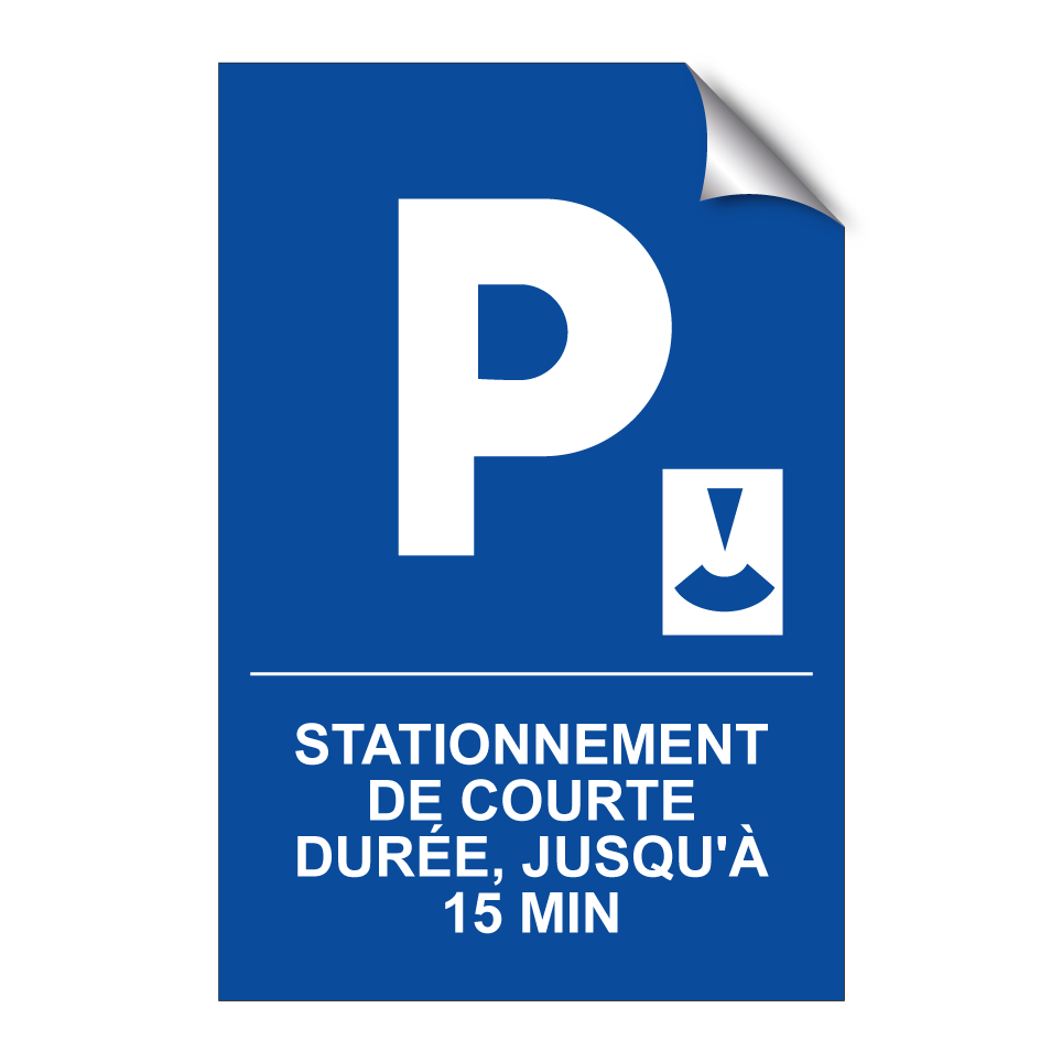 Panneau de stationnement avec le texte : "Stationnement de courte durée, jusqu'à 15 min." et une symbolique claire.