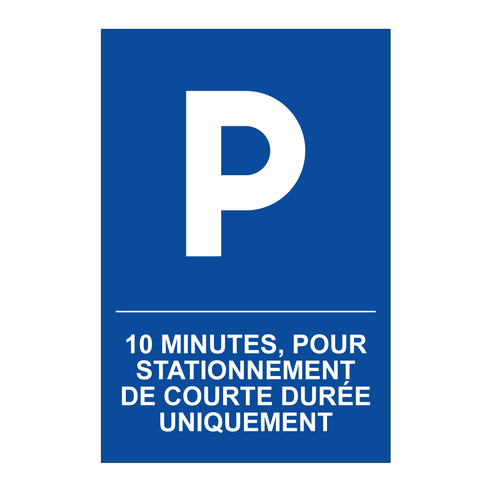Panneau de stationnement avec le texte : "10 minutes, pour stationnement de courte durée uniquement" et une symbolique claire.