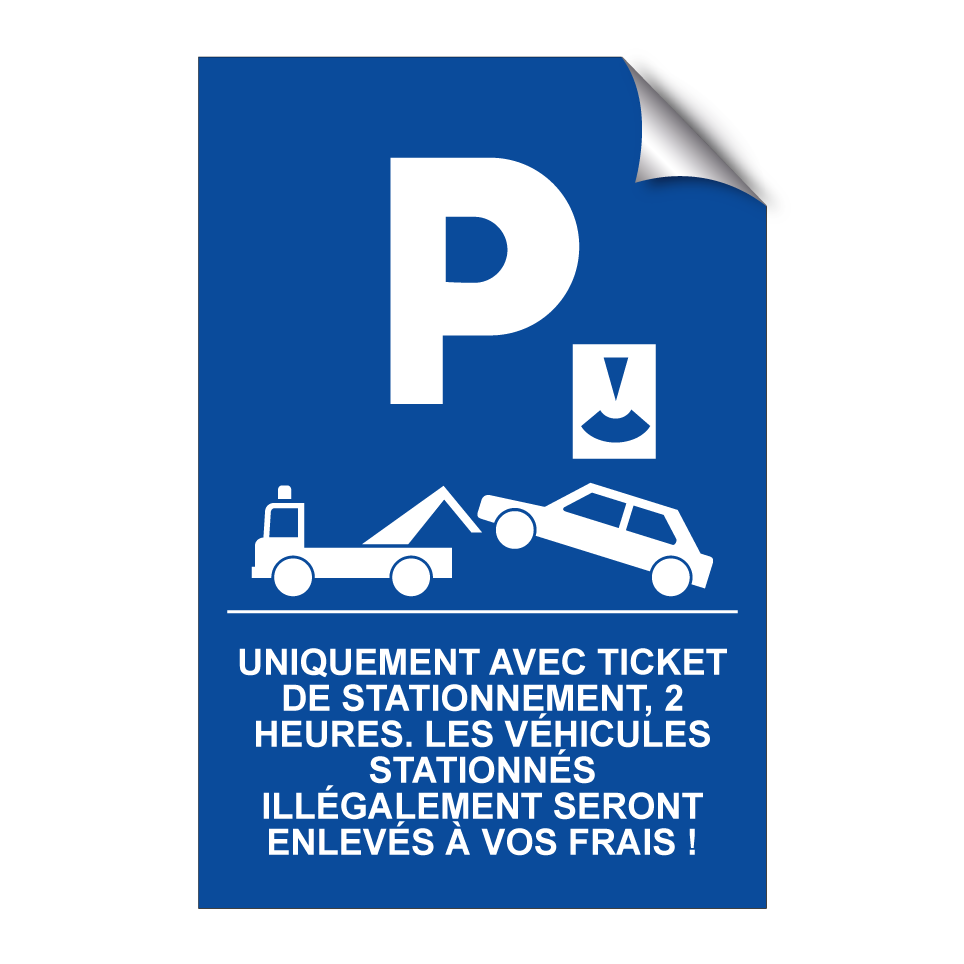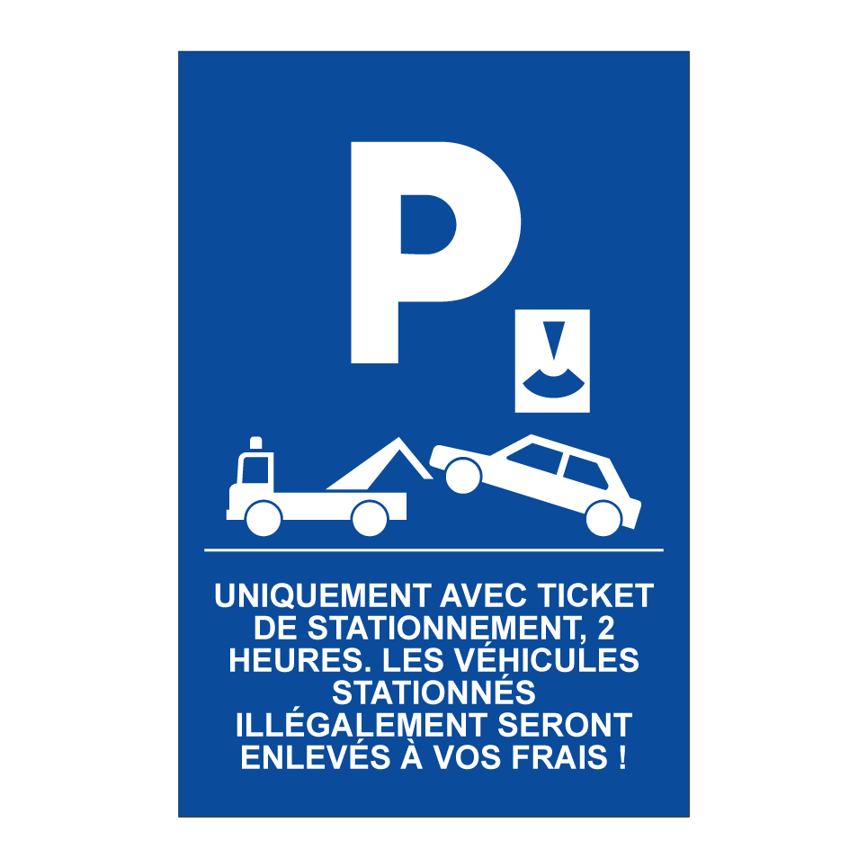Panneau de stationnement avec le texte : "Uniquement avec ticket de stationnement, 2 heures. Les véhicules stationnés illégalement seront enlevés à vos frais !" et une symbolique claire.
