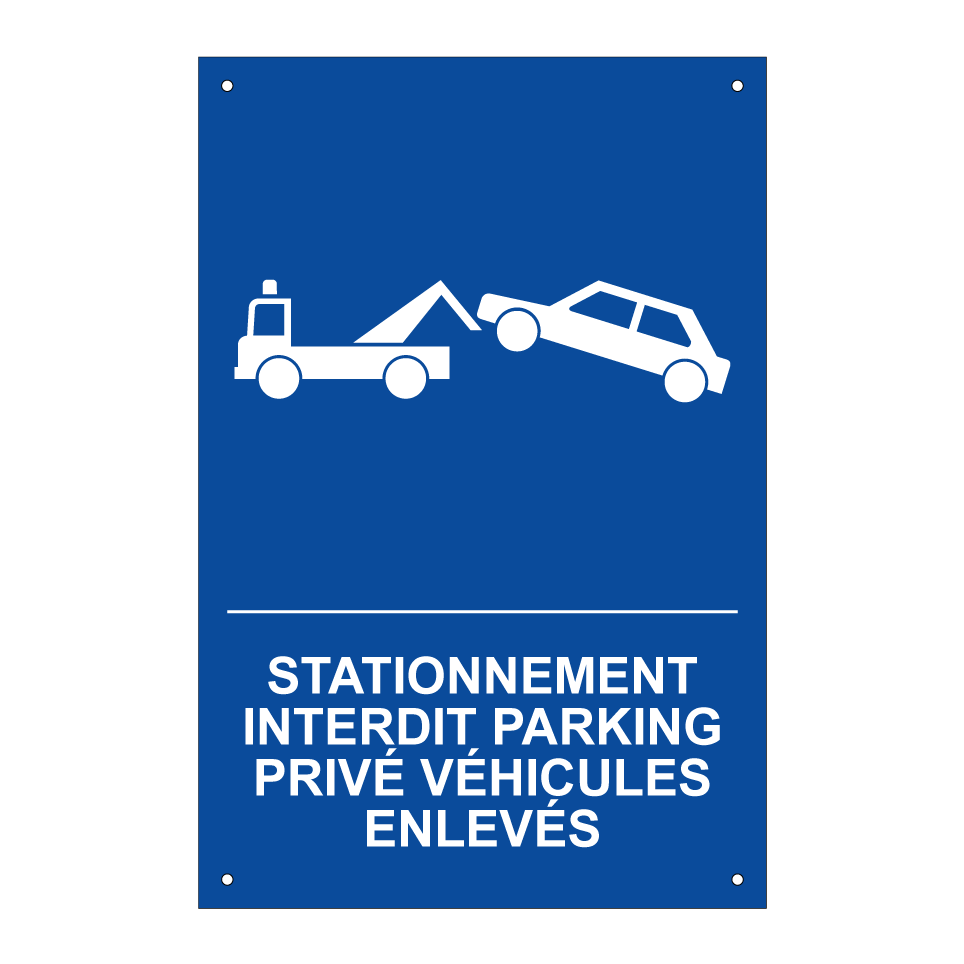 Panneau de stationnement avec le texte : "Stationnement interdit parking privé véhicules enlevés" et une symbolique claire.