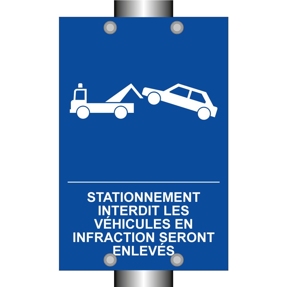 Panneau de stationnement avec le texte : "Stationnement interdit Les véhicules en infraction seront enlevés" et une symbolique claire.