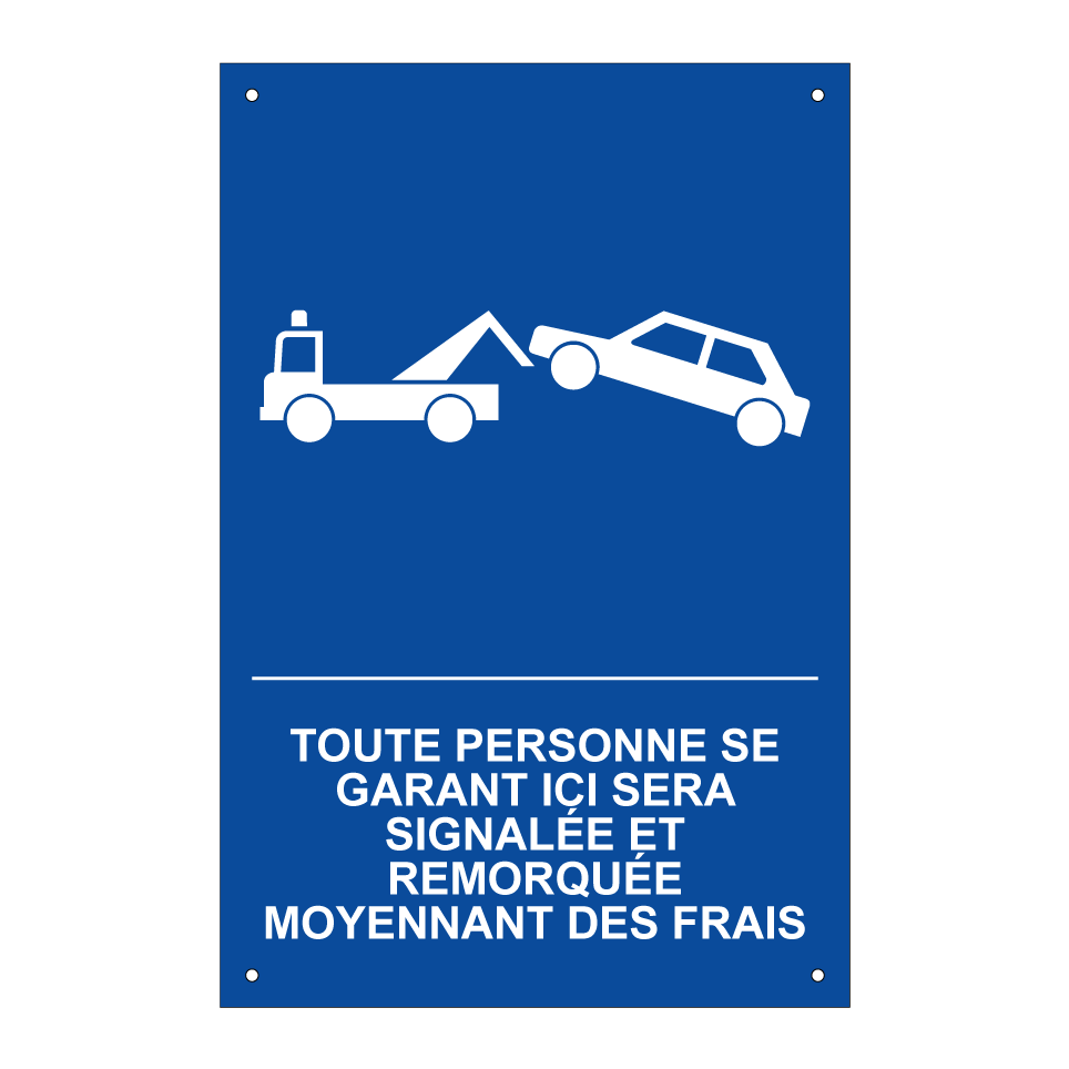Panneau de stationnement avec le texte : "Toute personne se garant ici sera signalée et remorquée moyennant des frais." et une symbolique claire.