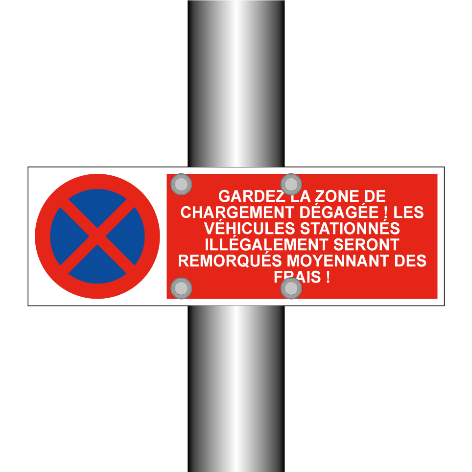 Panneau d'interdiction de stationner avec le texte : "Gardez la zone de chargement dégagée ! Les véhicules stationnés illégalement seront remorqués moyennant des frais !" et une symbolique claire.