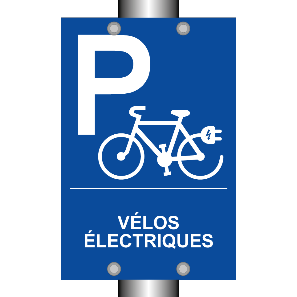 Panneau de stationnement avec le texte : "Vélos électriques" et une symbolique claire.