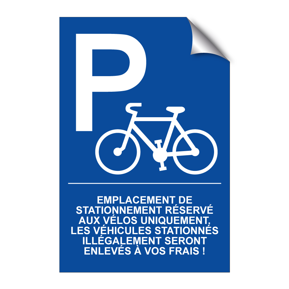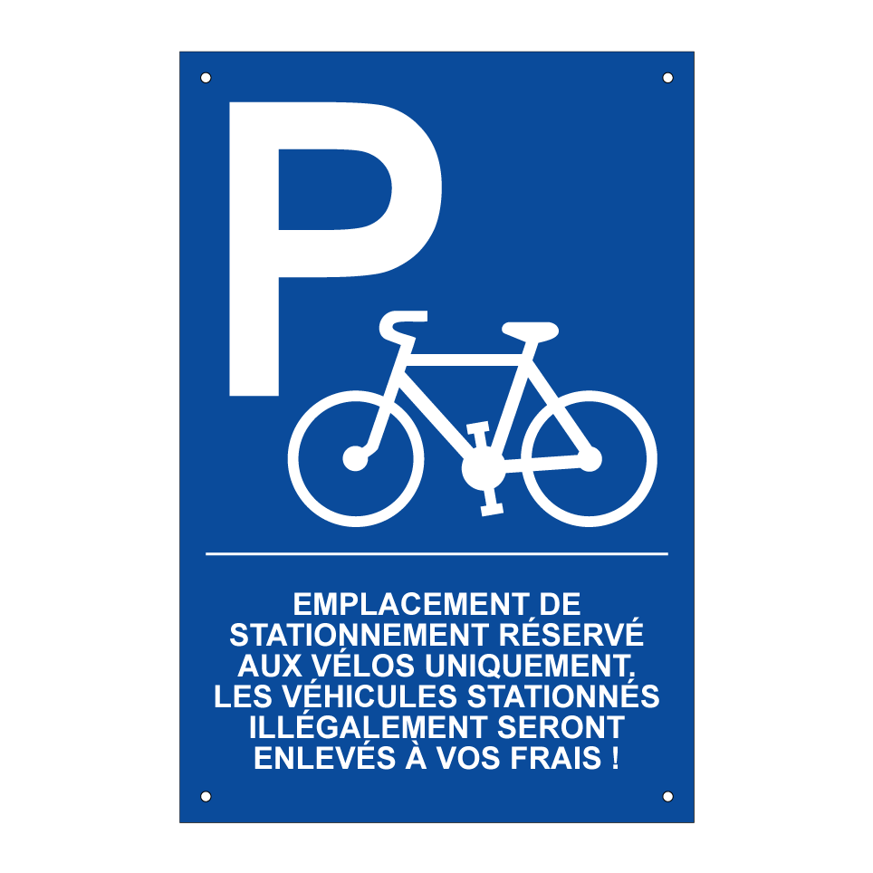 Panneau de stationnement avec le texte : "Emplacement de stationnement réservé aux vélos uniquement. Les véhicules stationnés illégalement seront enlevés à vos frais !" et une symbolique claire.