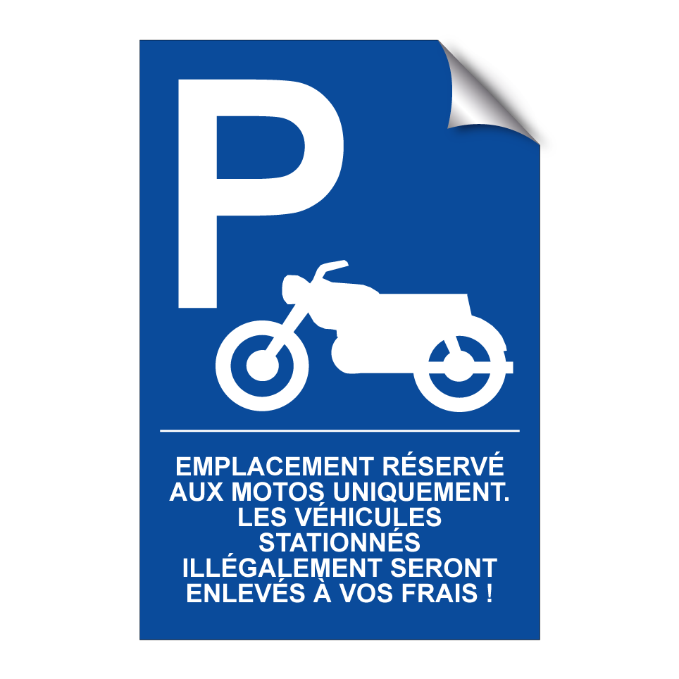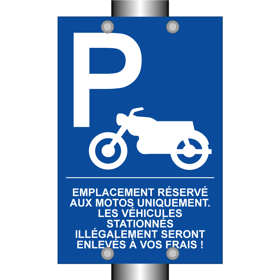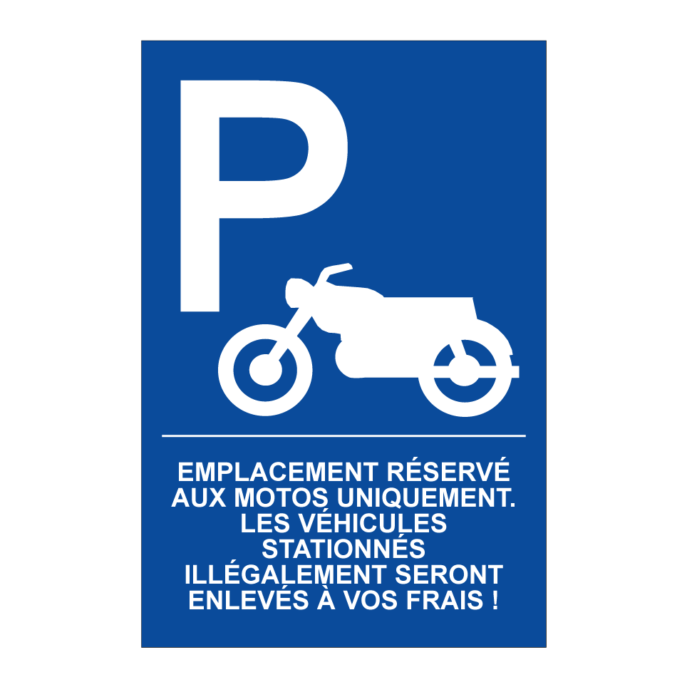 Panneau de stationnement avec le texte : "Emplacement réservé aux motos uniquement. Les véhicules stationnés illégalement seront enlevés à vos frais !" et une symbolique claire.