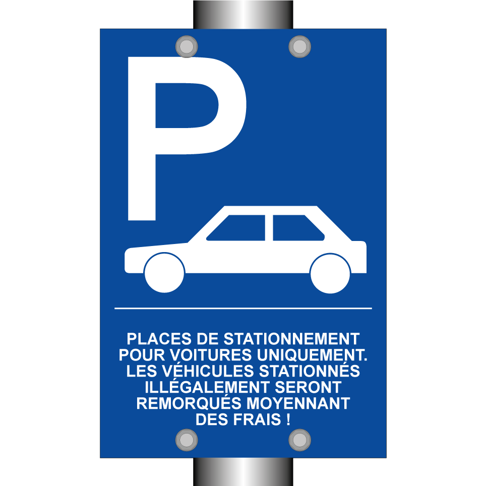 Panneau de stationnement avec le texte : "Places de stationnement pour voitures uniquement. Les véhicules stationnés illégalement seront remorqués moyennant des frais !" et une symbolique claire.