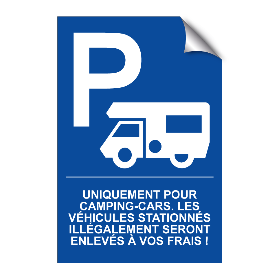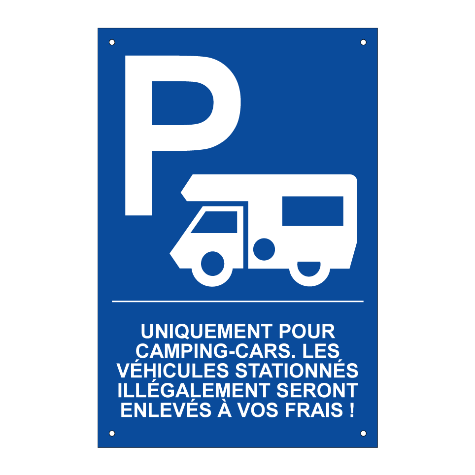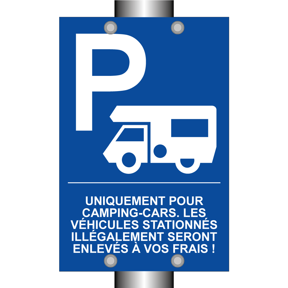 Panneau de stationnement avec le texte : "Uniquement pour camping-cars. Les véhicules stationnés illégalement seront enlevés à vos frais !" et une symbolique claire.