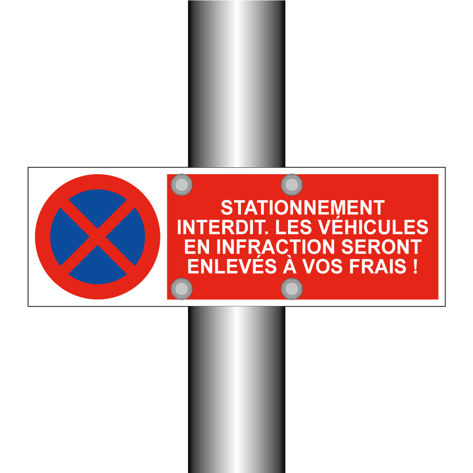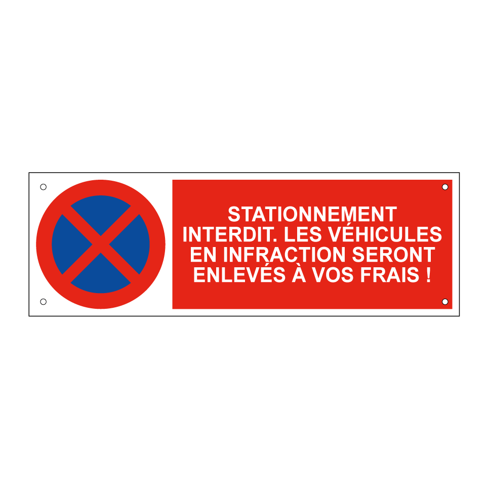 Panneau d'interdiction de stationner avec le texte : "Stationnement interdit. Les véhicules en infraction seront enlevés à vos frais !" et une symbolique claire.