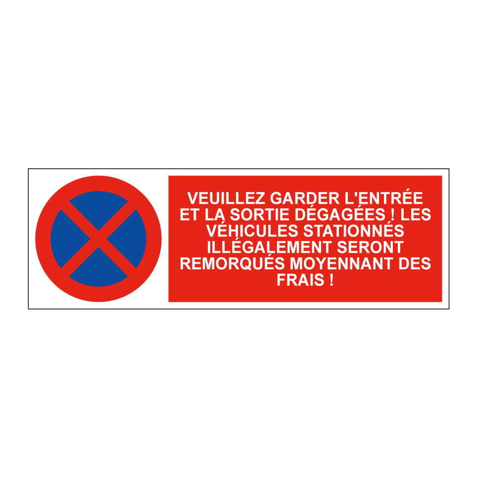 Panneau d'interdiction de stationner avec le texte : "Veuillez garder l'entrée et la sortie dégagées ! Les véhicules stationnés illégalement seront remorqués moyennant des frais !" et une symbolique claire.