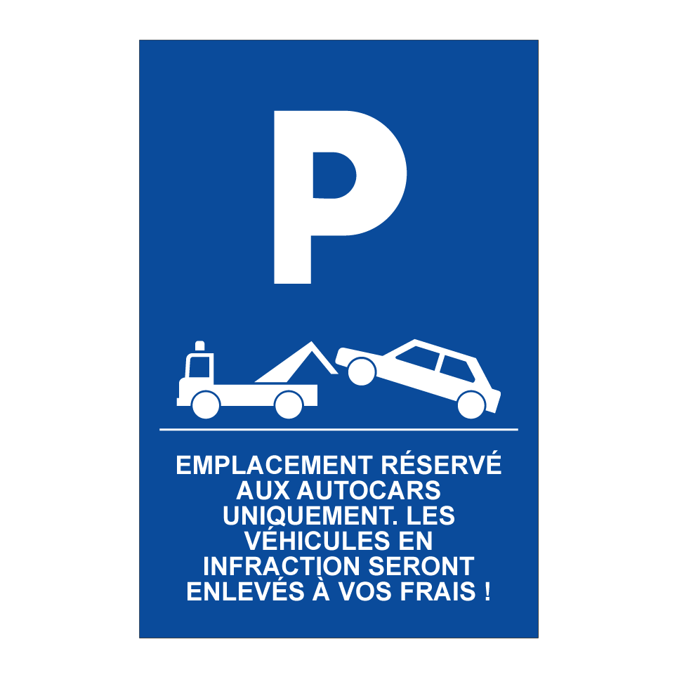 Panneau de stationnement avec le texte : "Emplacement réservé aux autocars uniquement. Les véhicules en infraction seront enlevés à vos frais !" et une symbolique claire.