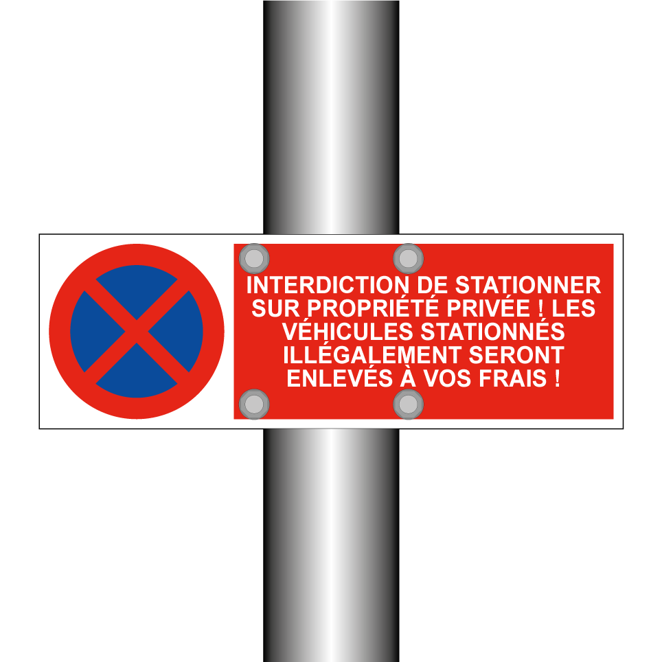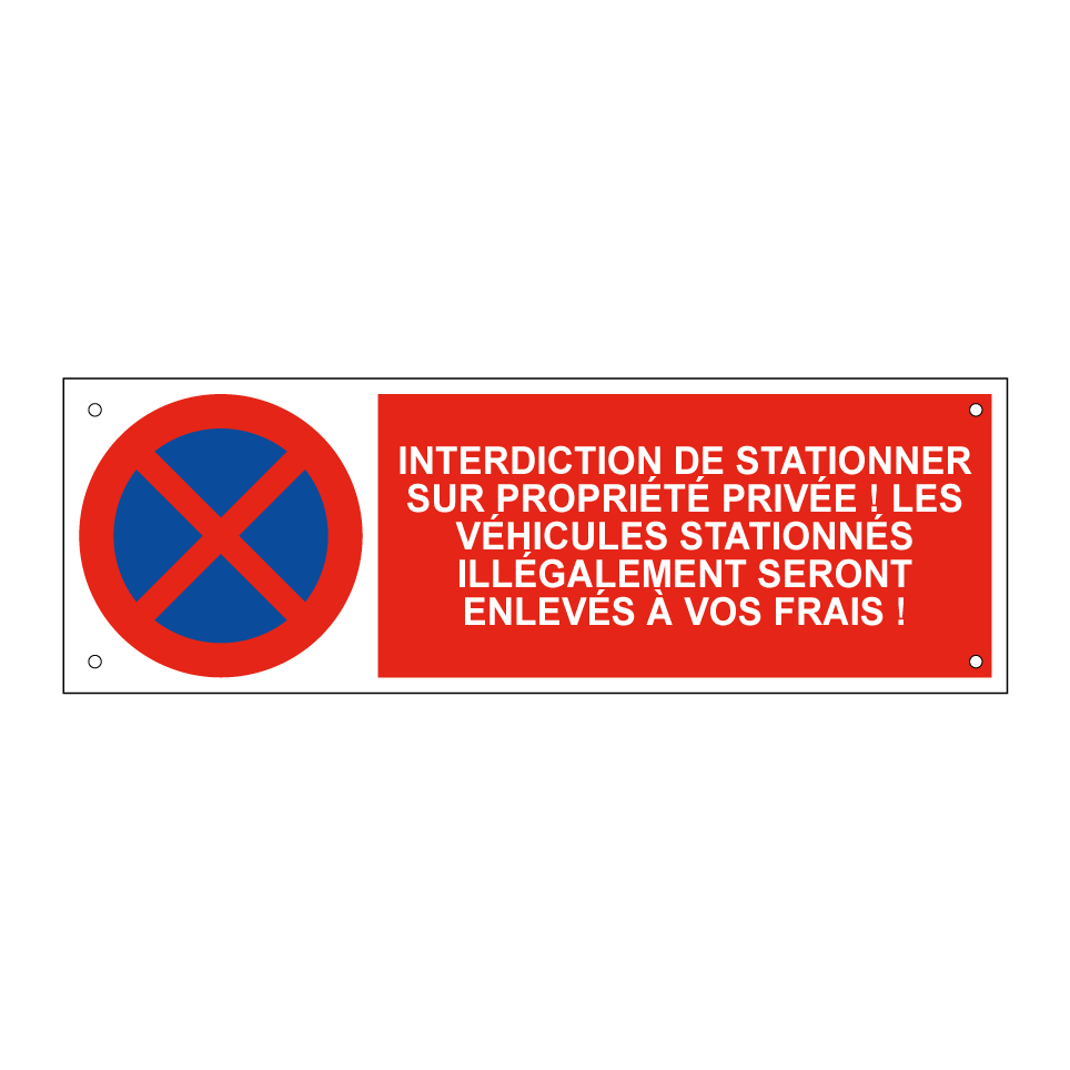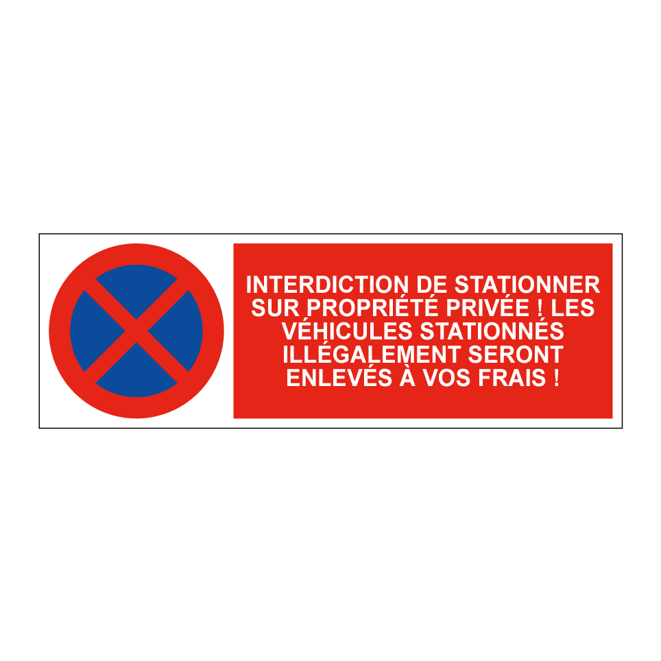 Panneau d'interdiction de stationner avec le texte : "Interdiction de stationner sur propriété privée ! Les véhicules stationnés illégalement seront enlevés à vos frais !" et une symbolique claire.