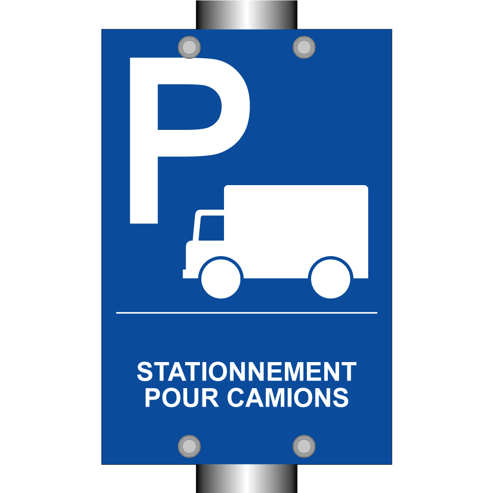 Panneau de stationnement avec le texte : "Stationnement pour camions" et une symbolique claire.