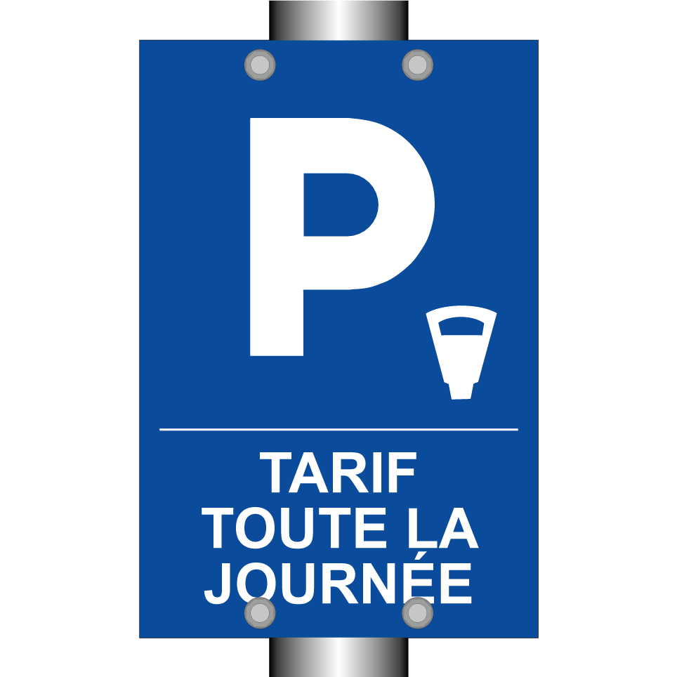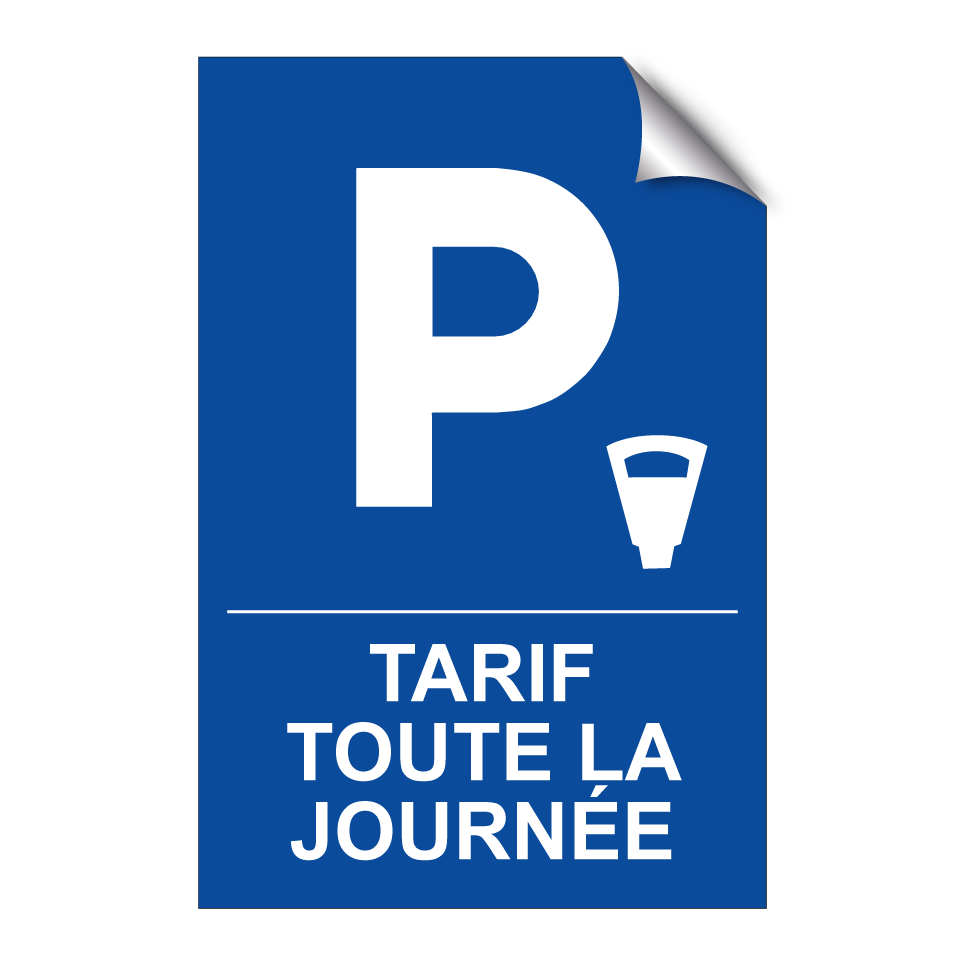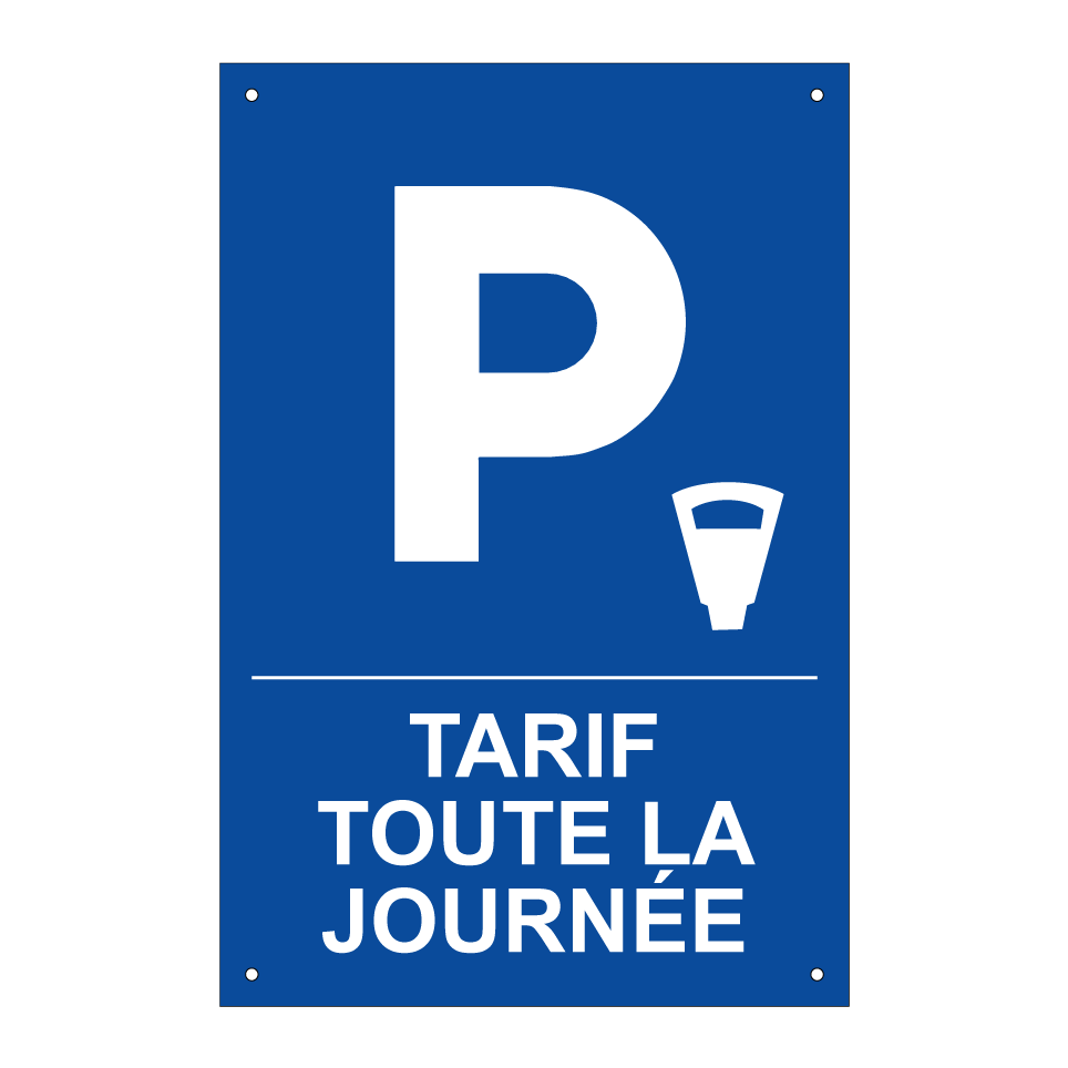 Panneau de stationnement avec le texte : "Tarif toute la journée" et une symbolique claire.