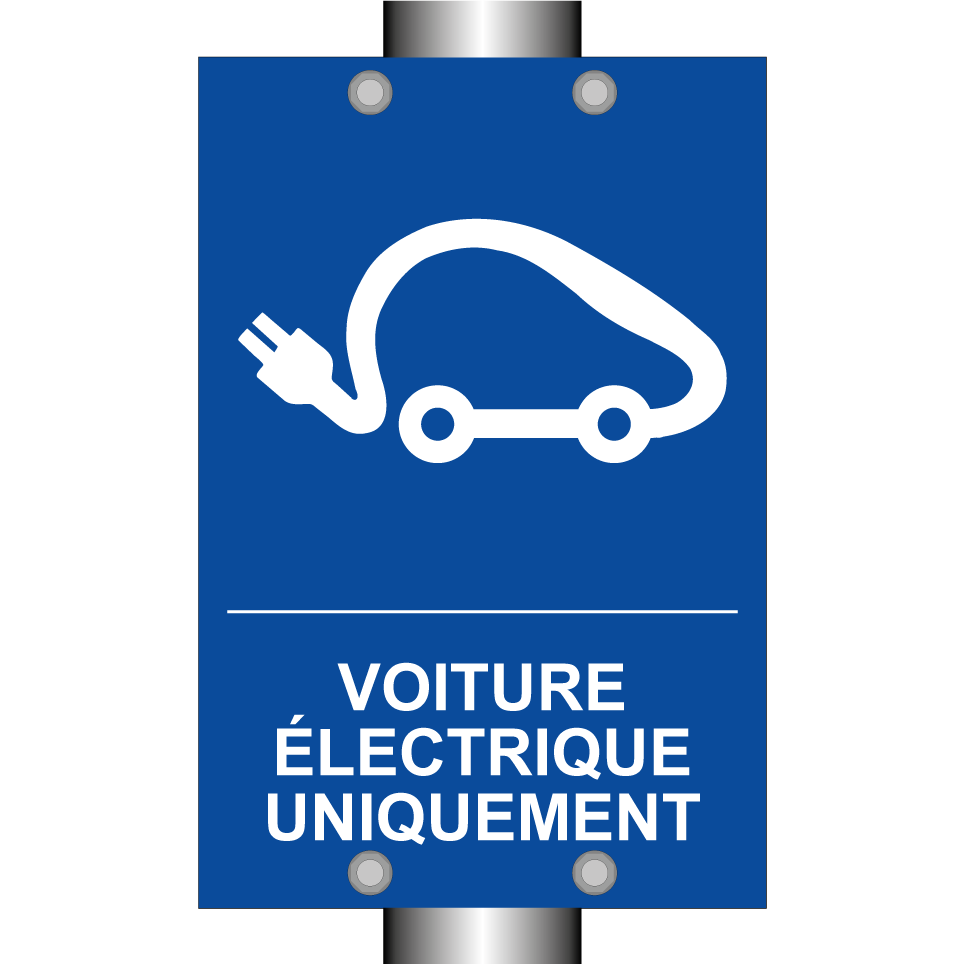 Panneau de stationnement avec le texte : "Voiture électrique uniquement" et une symbolique claire.