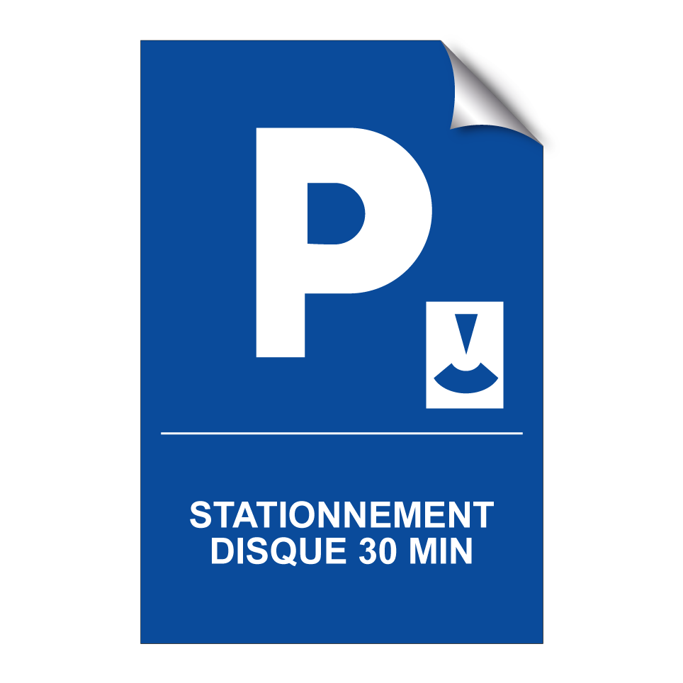 Panneau de stationnement avec le texte : "Stationnement disque 30 min" et une symbolique claire.