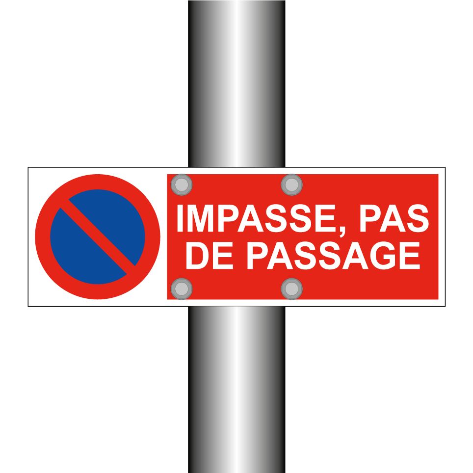 Panneau d'interdiction de stationner avec le texte : "Impasse, pas de passage" et une symbolique claire.