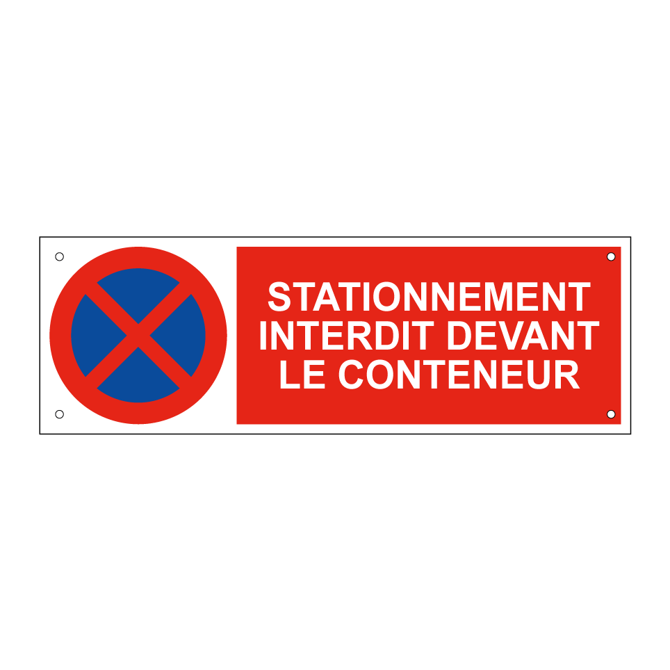 Panneau d'interdiction de stationner avec le texte : "Stationnement interdit devant le conteneur" et une symbolique claire.