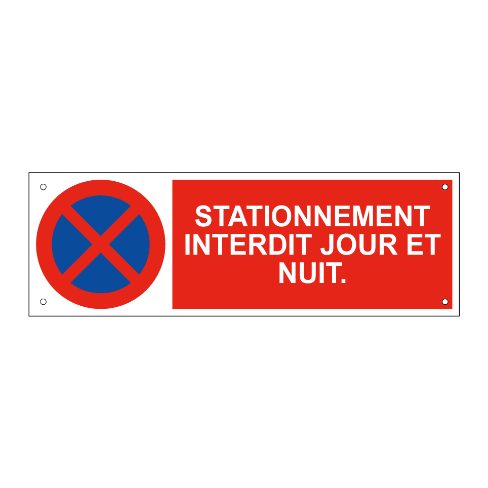 Panneau d'interdiction de stationner avec le texte : "Stationnement interdit jour et nuit." et une symbolique claire.