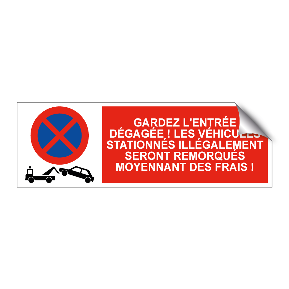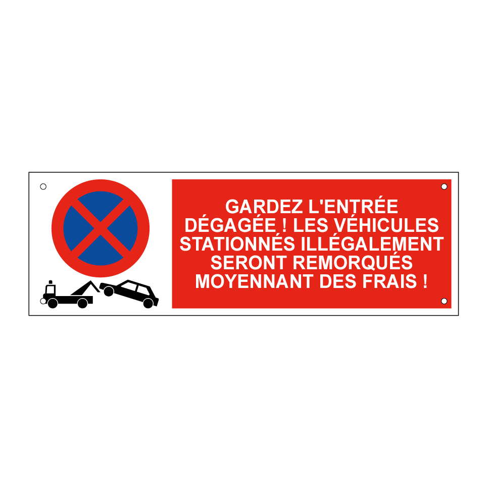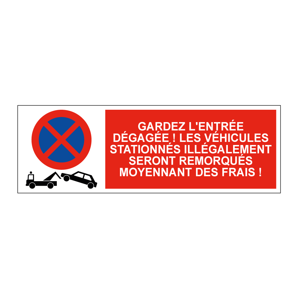 Panneau d'interdiction de stationner avec le texte : "Gardez l'entrée dégagée ! Les véhicules stationnés illégalement seront remorqués moyennant des frais !" et une symbolique claire.