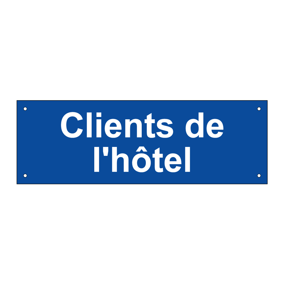 Ce panneau de stationnement est idéal pour indiquer les places réservées aux clients de l'hôtel. Avec son fond bleu et son texte blanc, il est facilement visible et attire l'attention. Ce panneau peut être installé à l'entrée du parking de l'hôtel, près de la réception ou dans les zones de stationnement désignées. Il assure que les espaces sont utilisés correctement et améliore l'expérience des visiteurs en garantissant un accès facile et rapide. Parfait pour maintenir l'ordre et la satisfaction des clients.