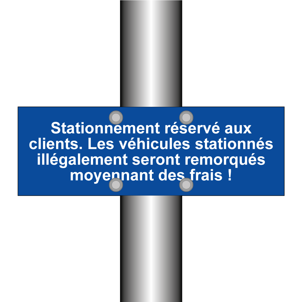 Panneau de stationnement avec le texte : "Stationnement réservé aux clients. Les véhicules stationnés illégalement seront remorqués moyennant des frais !".