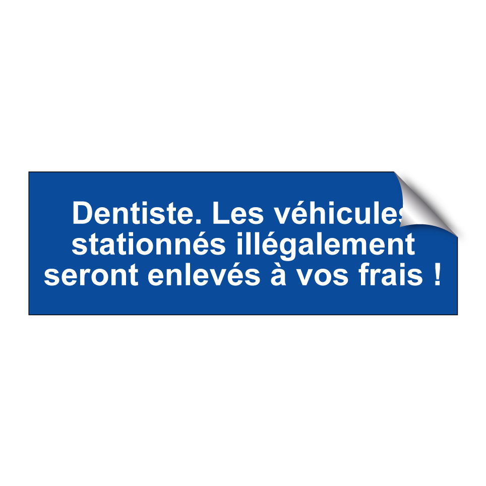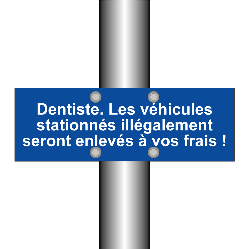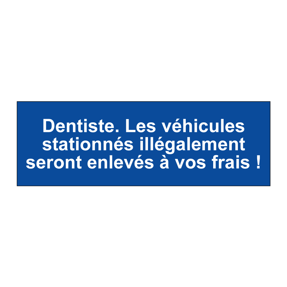 Panneau de stationnement avec le texte : "Dentiste. Les véhicules stationnés illégalement seront enlevés à vos frais !".