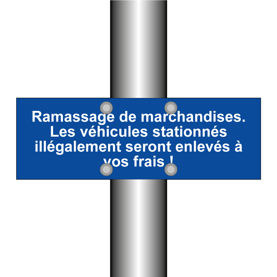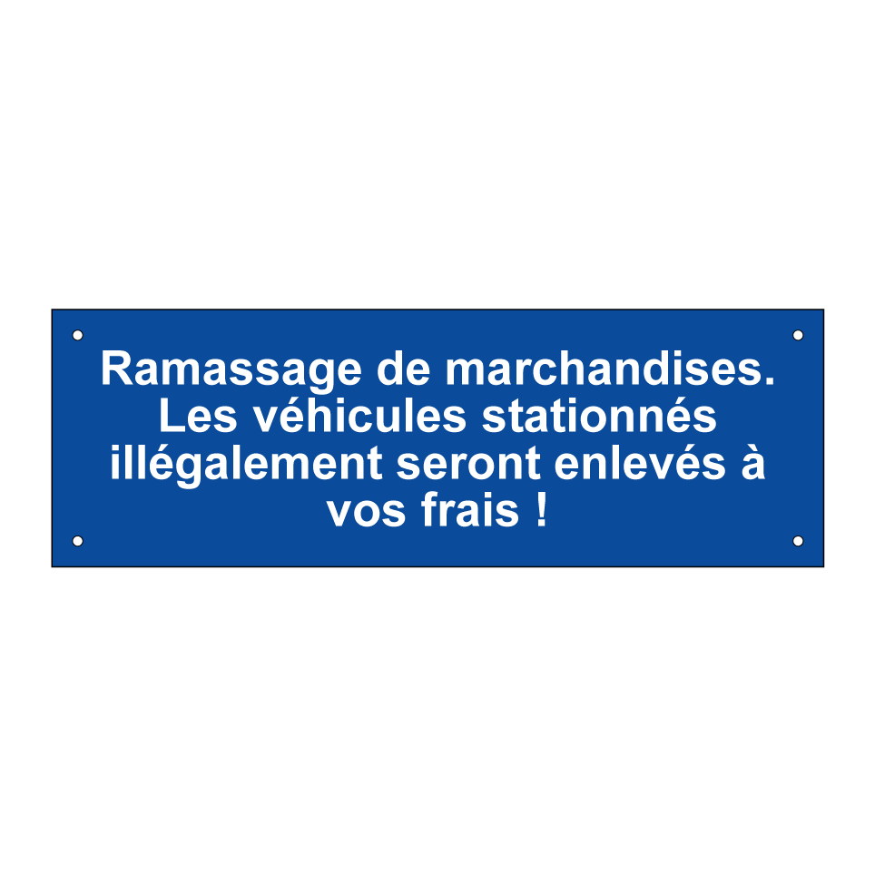 Panneau de stationnement avec le texte : "Ramassage de marchandises. Les véhicules stationnés illégalement seront enlevés à vos frais !".